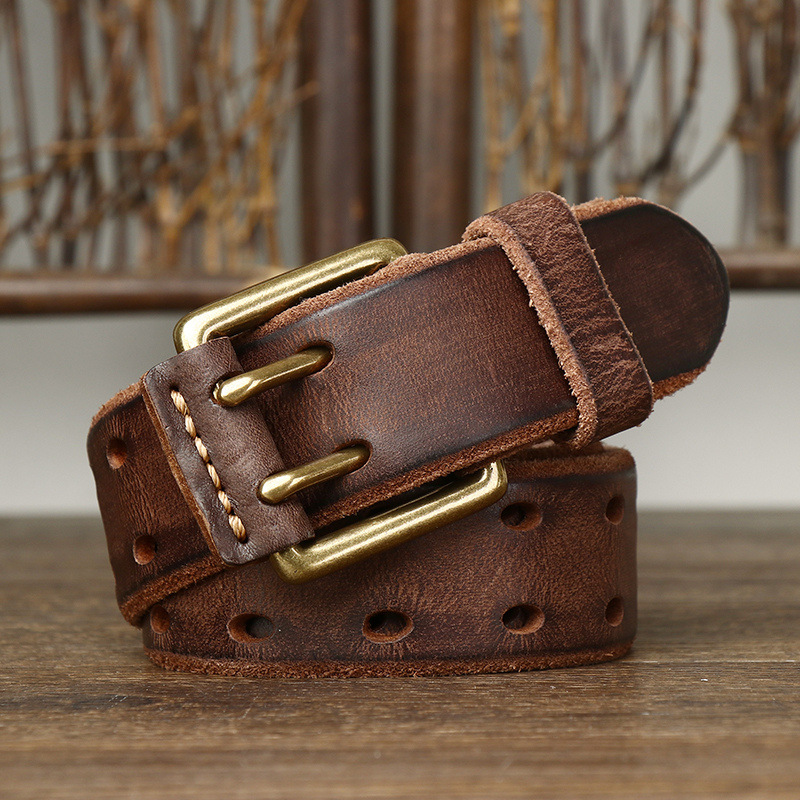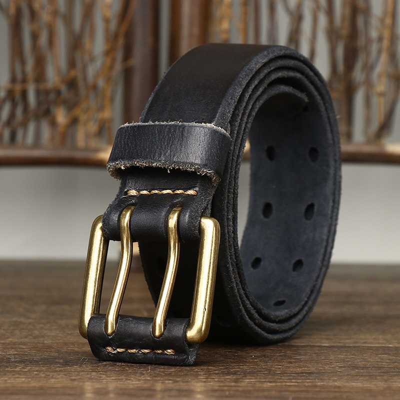 • 3.8cm Vintage Men’s Belt Real Cowhide Genuine Leather Belt Copper Double Needle Buckle Handmade Jeans Belt Fashion Male Strap