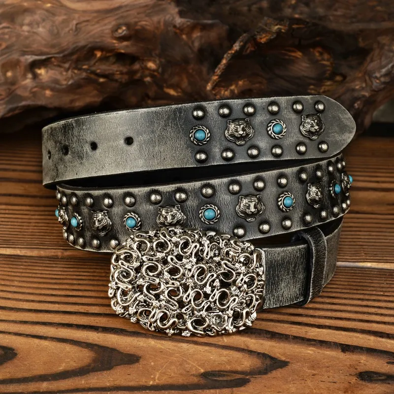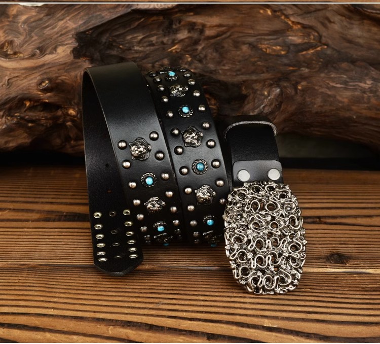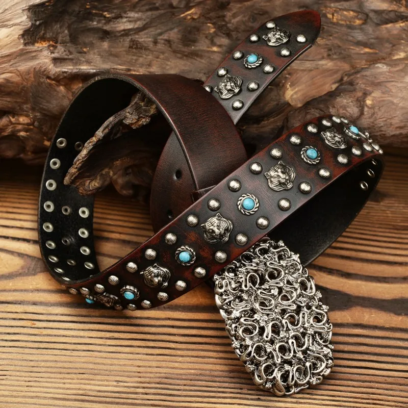 Retro Heavy Metal Rivets Men’s Belt Harley Locomotive Rock Punk Style Personality Belt Extra Thick Genuine Leather Jeans Belt
