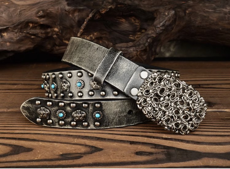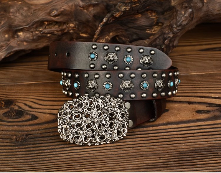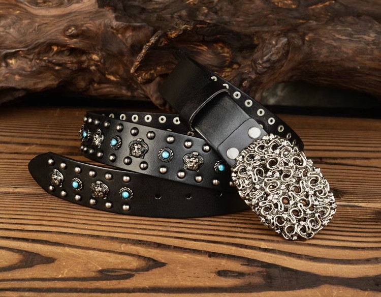 • Retro Heavy Metal Rivets Men’s Belt Harley Locomotive Rock Punk Style Personality Belt Extra Thick Genuine Leather Jeans Belt